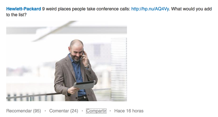 LinkedIn es quizá la más especializada de todas las grandes redes. Se conecta con seguidores, pero, sobre todo, se conecta con colegas del sector, proveedores, asociados, incluso con la competencia. En un tono algo más serio, se deben proponer debates sobre la profesión o el sector. Hewlett-Packard es una de las compañías más activas en LinkedIn. Enlaza artículos como éste, en el que se habla de los lugares más extraños donde se celebran videoconferencias, pero no se olvida de preguntar a sus lectores si ellos conocen otros.