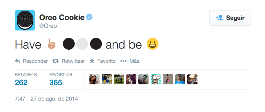 Oreo, fiel a su filosofía de marca, ha optado por la diversión en sus redes sociales. Además, siempre busca la originalidad, en este caso, en la ubicación de las imágenes, que, en vez de un adjunto, se incrustan en el mensaje de un tuit brevísimo.