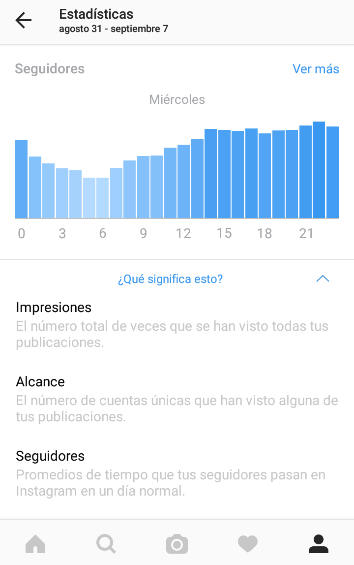 Por último, otra acción de la página es “Actividad de los Seguidores” y en ella muestra cuando tus seguidores son más activos en Instagram. Toca “ver más” para ver conocer el número total de seguidores, por sexo y edad, lugar y cuándo es más probable que inicien sesión por días y horas.